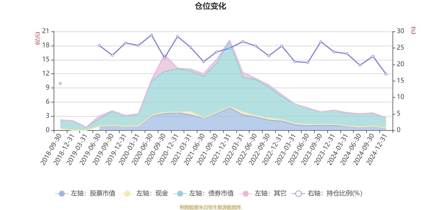 基金管理人在四季报中表示,权益操作方面,本基金本报告期内整体仓位较上季度有所降低。增加了银行、电信运营商等高分红板块的持仓,大幅减持了科技股。 展望 2025 年,我们认为随着 2024 年下半年一系列稳经济和刺激消费的政策逐步落地,经济将逐步走向好转,而目前市场的估值处于相对较低位置,未来有望走出估值修复行情。