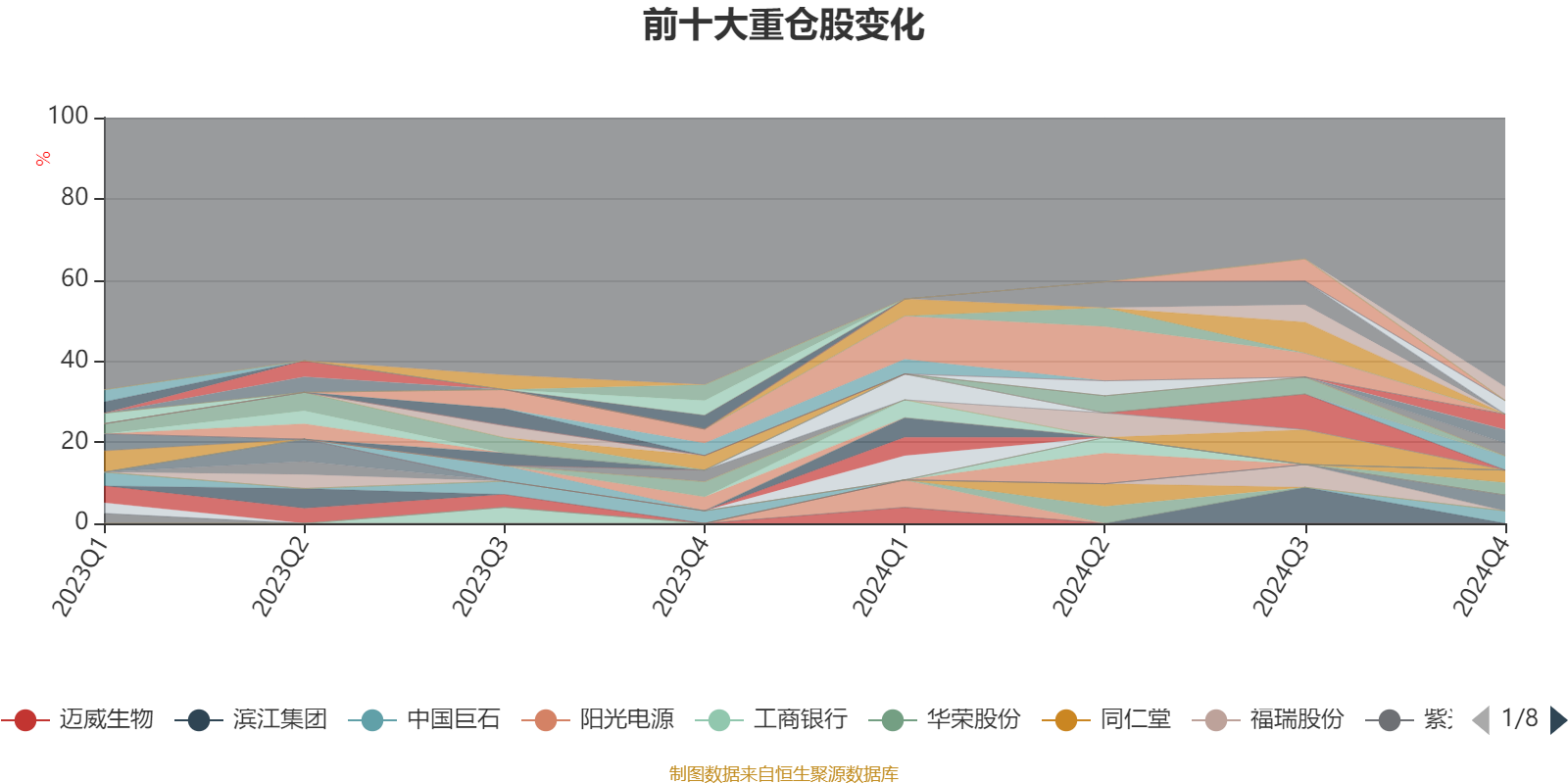 截至2024年四季度末,基金十大重仓股分别是伊利股份、兴业银行、浦发银行、中国石化、国电南瑞、保利发展、春秋航空、中国巨石、民生银行、新澳股份。