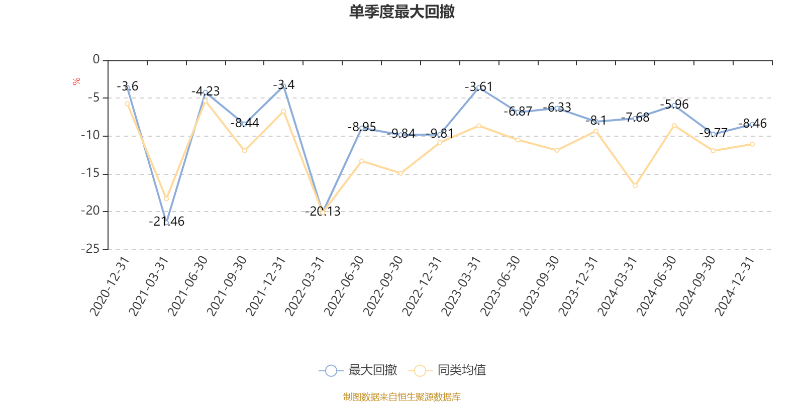 截至1月21日,基金近三年最大回撤为24.96%,同类可比基金排名424/443。单季度最大回撤出现在2021年一季度,为21.46%。