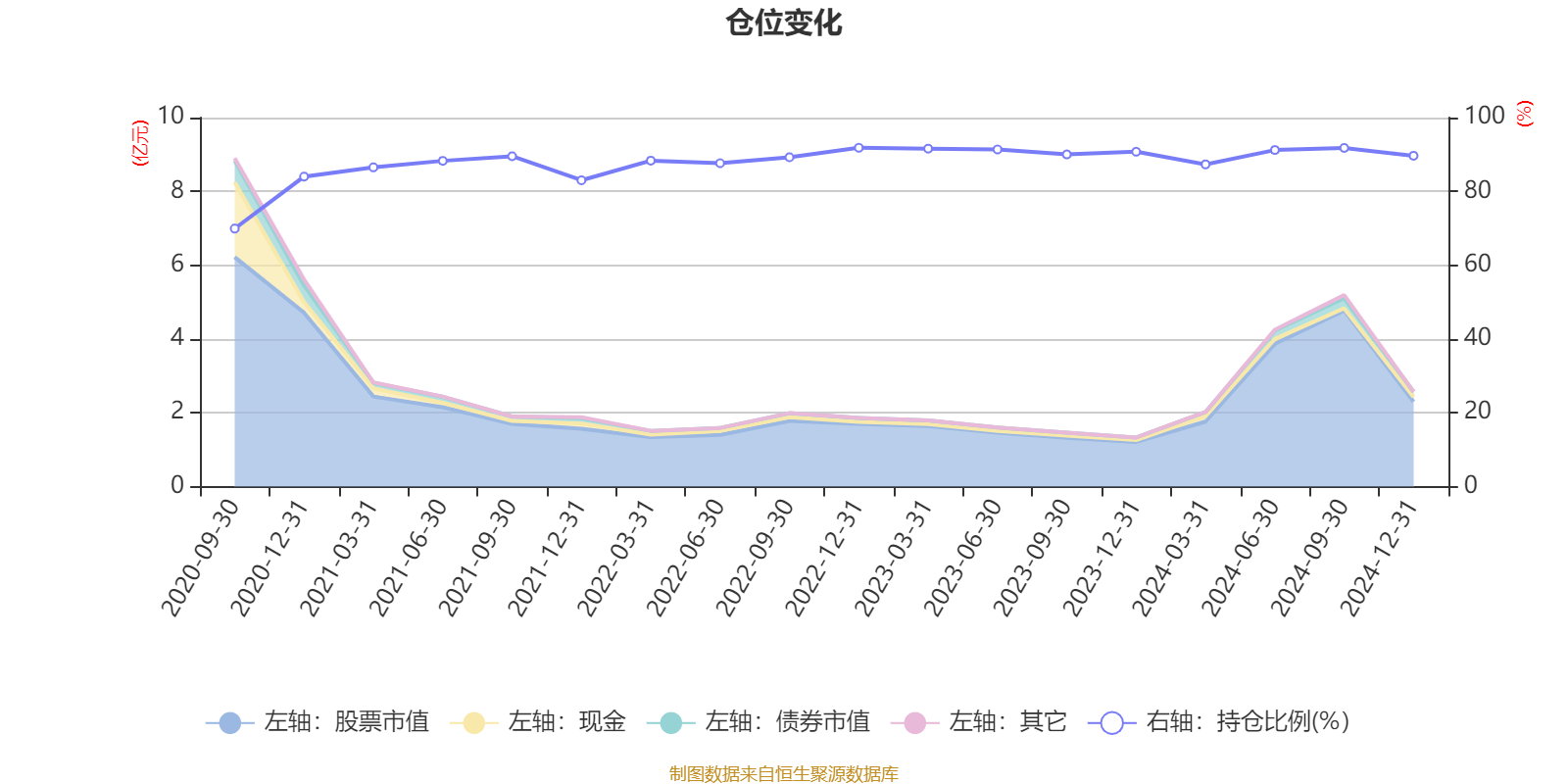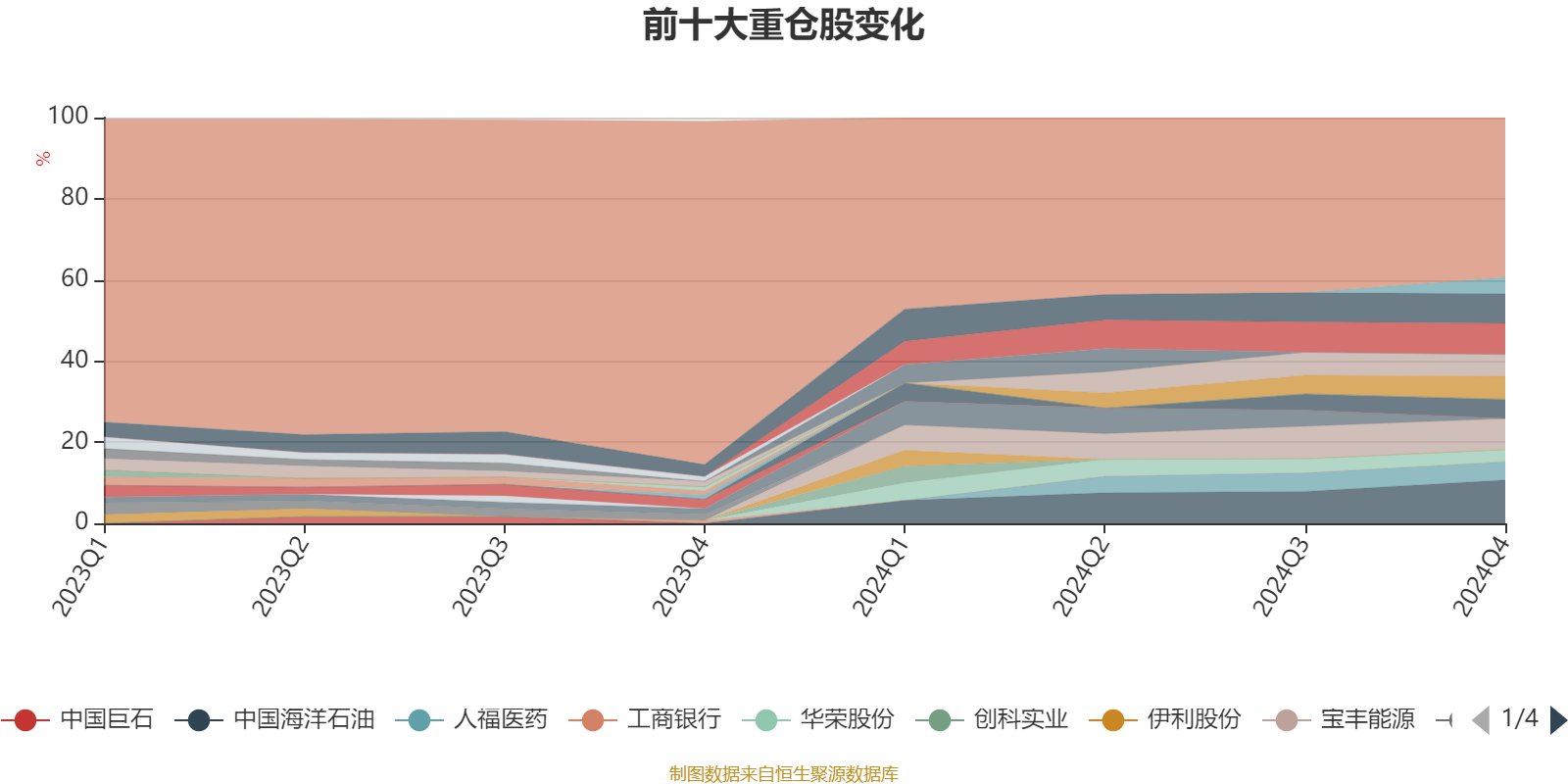 截至2024年四季度末,基金十大重仓股分别是中国海洋石油、宝丰能源、腾讯控股、贵州茅台、华润万象生活、美的集团、五粮液、人福医药、新秀丽、华荣股份。